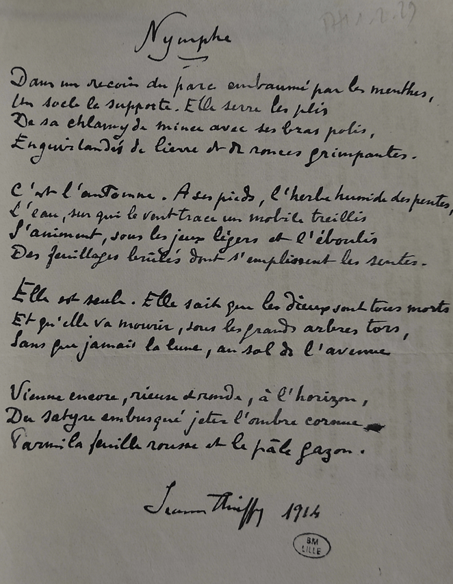 Outre ses œuvres pour piano comme Flandre ou un Choral qu’elle dédie à Cortot, Jeanne Thieffry met en musique les poètes qu’elle apprécie, Verlaine, Gautier ou Klingsor ou son compatriote Albert Samain.