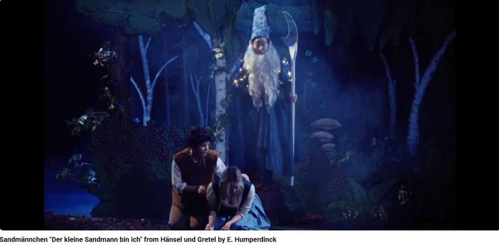 Acte II : Gretel, qui a rempli son panier de fraises, fait une pause (Air : « Ein Männlein steht im Walde ».) Hänsel en fait autant. Ils écoutent les oiseaux, spécialement le coucou dont on reconnaît le chant. Mais la nuit tombe et ils commencent à avoir peur. Le marchand de sable passe et les endort (Berceuse : « Der kleine Sandmann bin ich ».)