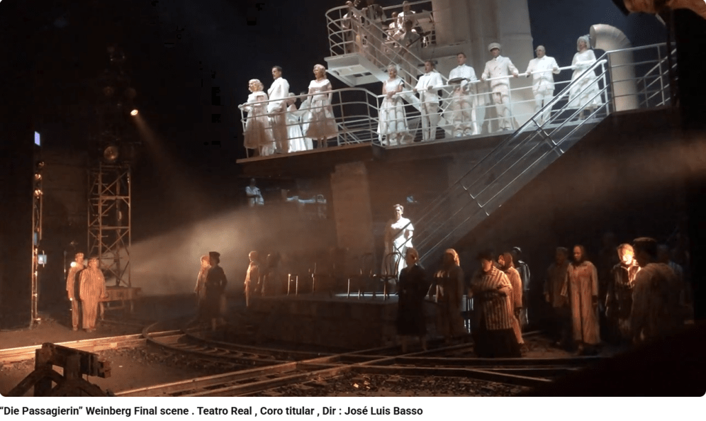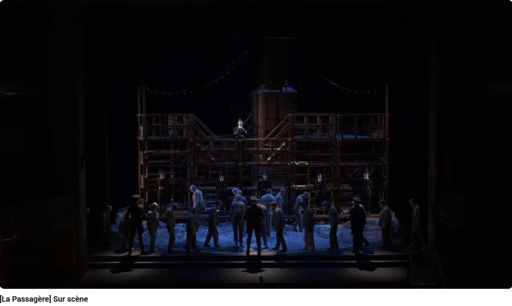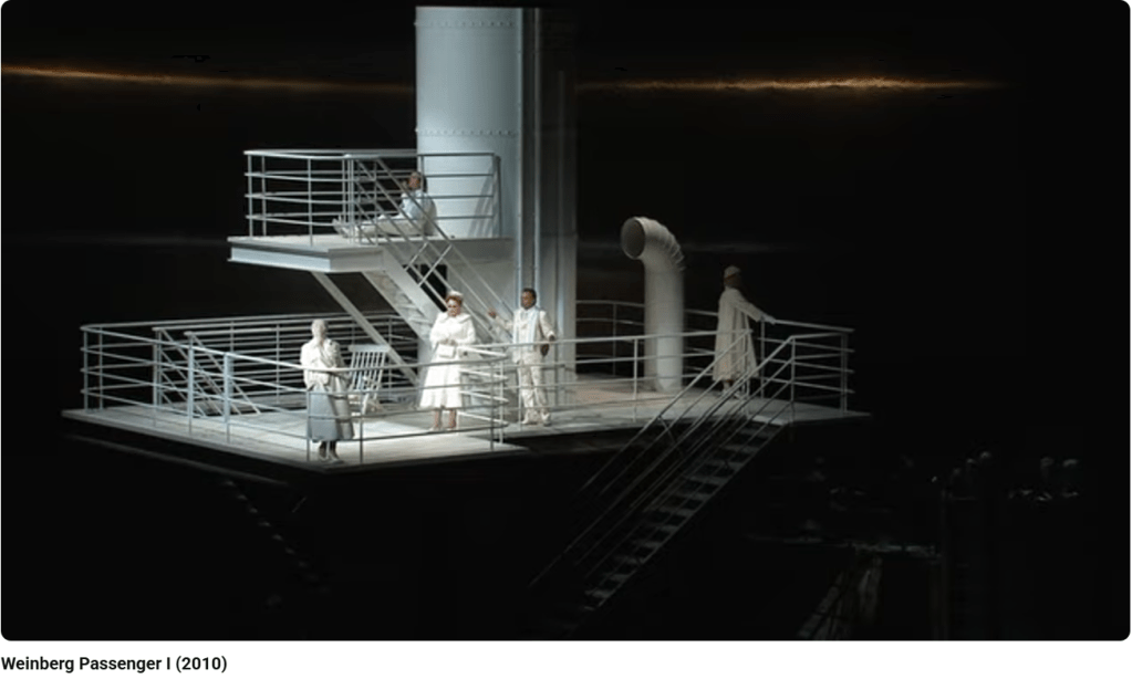 La Passagère est un opéra de Mieczyslaw Weinberg (1919-1996) terminé en 1968, mais jamais joué du vivant du compositeur, victime de la censure et de l’antisémitisme qui régnait en URSS à cette époque. Il sera créé en version de concert à Moscou le 25 décembre 2006, avant une création scénique à Bregenz le 21 juillet 2010. Alors que le livret original de Weinberg est en russe, le metteur en scène de la création à Bregenz fait s’exprimer chaque personnage dans sa propre langue, allemand, polonais, français, russe, yiddish…