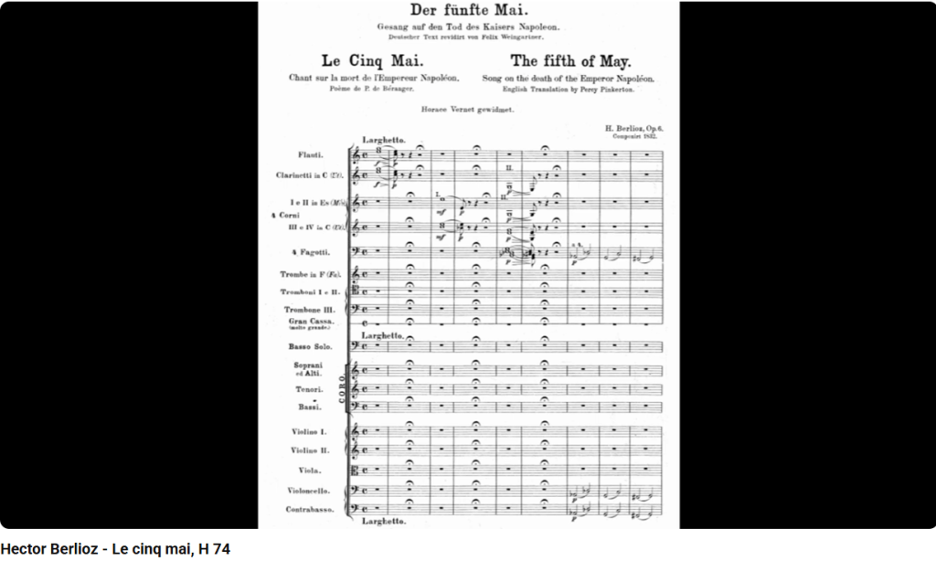 Berlioz a écrit une cantate, le 5 mai, sur la mort de l’empereur, survenue le 5 mai 1821. Elle est rarement jouée.