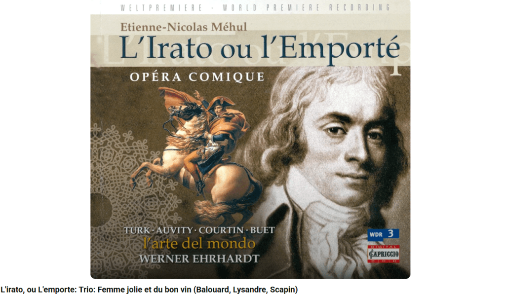 En 1800, Bonaparte commande à Méhul un Chant du 14 juillet 1800, après le succès du Chant du départ. Méhul a écrit une trentaine d’opéras, dont l’Irato (1801), une réponse au premier consul qui prétendait que l’opéra bouffe était réservé à l’Italie. Méhul écrira donc un faux opéra italien, et ne dévoilera qu’il en était l’auteur qu’après que celui-ci eut remporté le succès.
